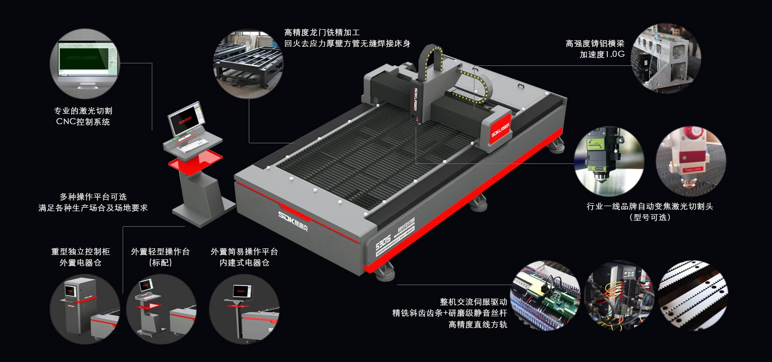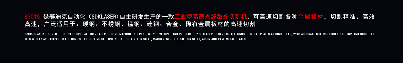 S3015 是賽迪克自動化(SDK LASER) 自主研發生產的一款工業型高速光纖激光切割機, 可高速切割各種金屬板材, 切割精準、高效高速,廣泛適用于:碳鋼、不銹鋼、錳鋼、硅鋼、合金、稀有金屬板材的高速切割。