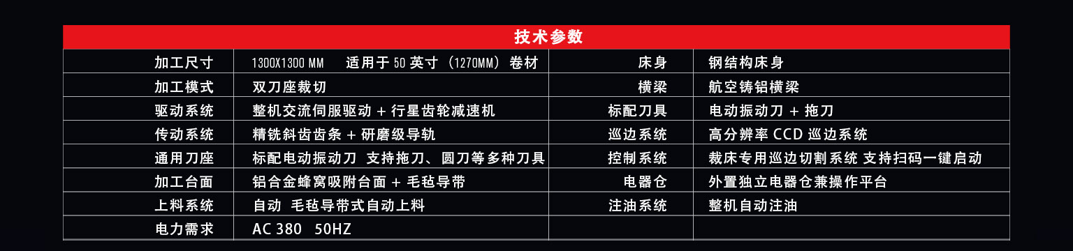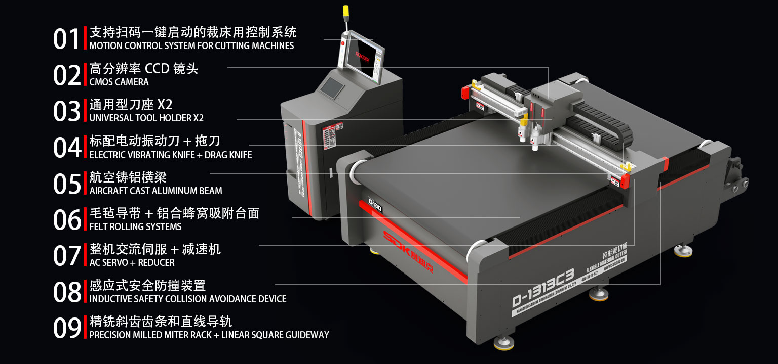D-1313C3是一款對應柔性卷材的高速異形裁切設備,采用導帶式加工平臺適合超長材料的連續切割。雙刀座,標配電動振動刀和拖刀,通用型的刀座支持圓刀、寫切刀、壓痕刀等多種刀具。支持掃碼一鍵啟動的裁床用巡邊控制系統,可高速完成柔性材料的裁切、半切、壓痕,開槽,沖孔,輪廓識別裁切等多項工藝。