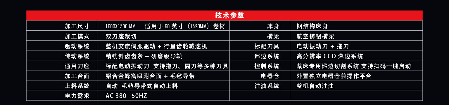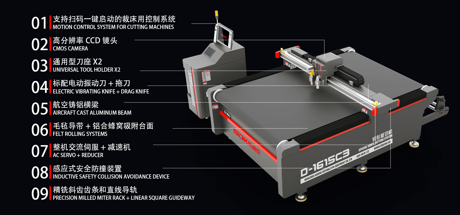 D-1615C3是一款對應柔性卷材的高速異形裁切設備,采用導帶式加工平臺適合超長材料的連續切割。雙刀座,標配電動振動刀和拖刀,通用型的刀座支持圓刀、寫切刀、壓痕刀等多種刀具。支持掃碼一鍵啟動的裁床用巡邊控制系統,可高速完成柔性材料的裁切、半切、壓痕,開槽,沖孔,輪廓識別裁切等多項工藝。