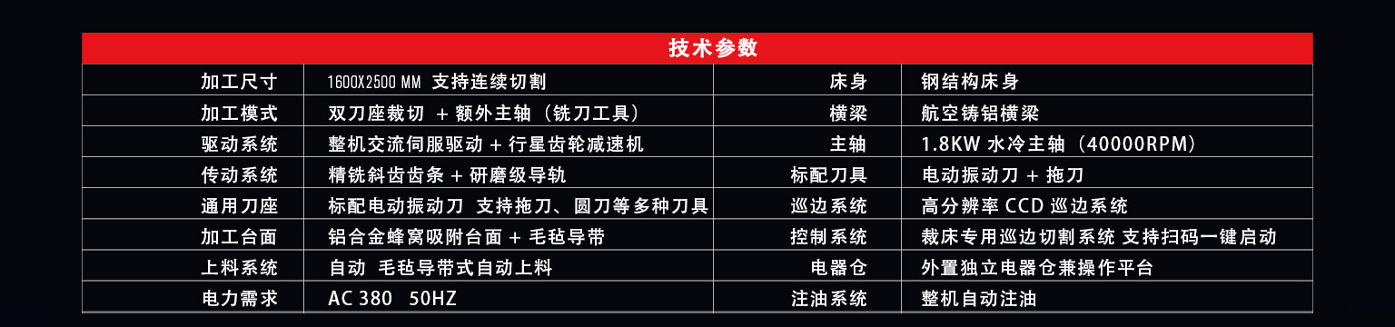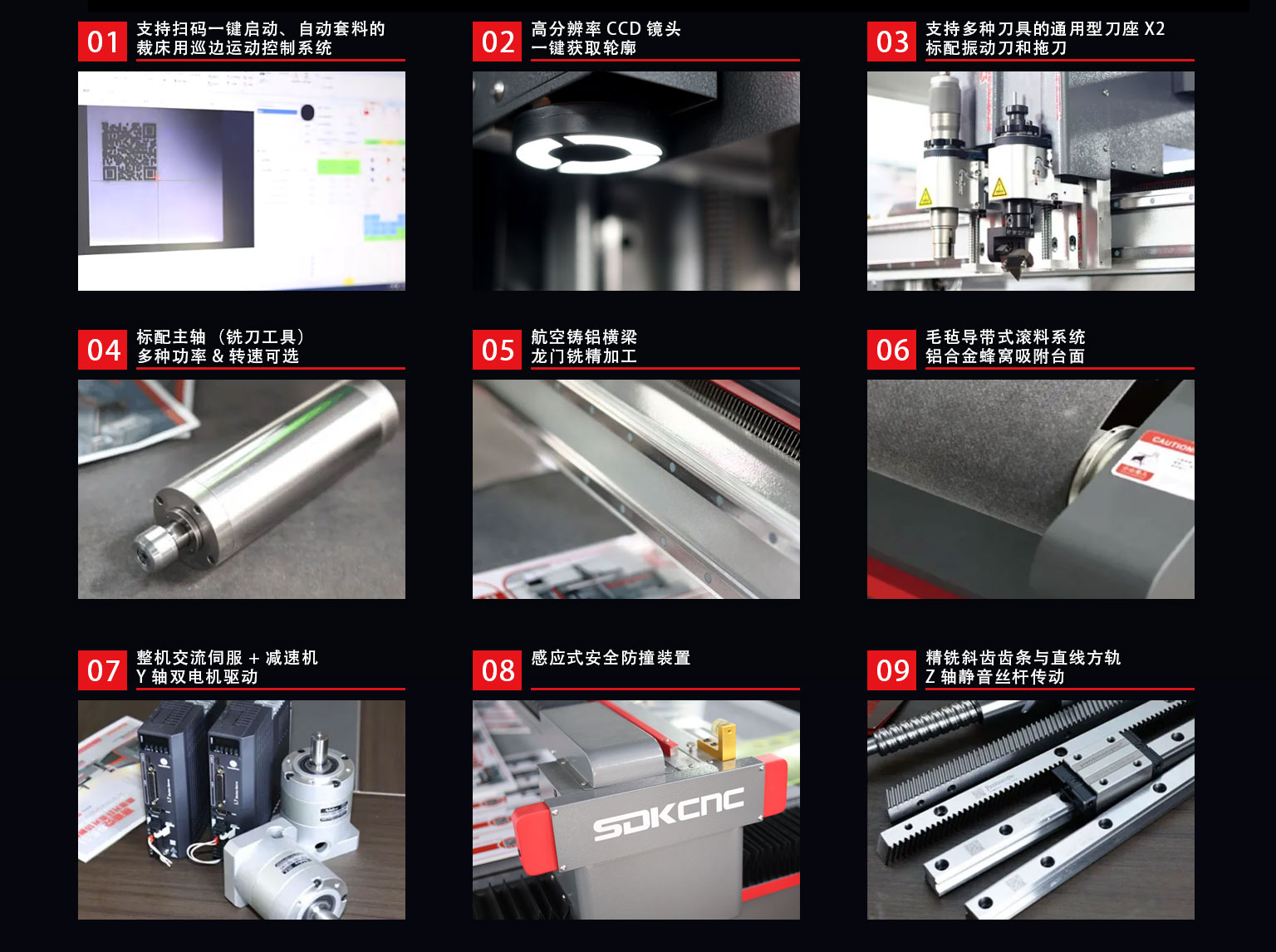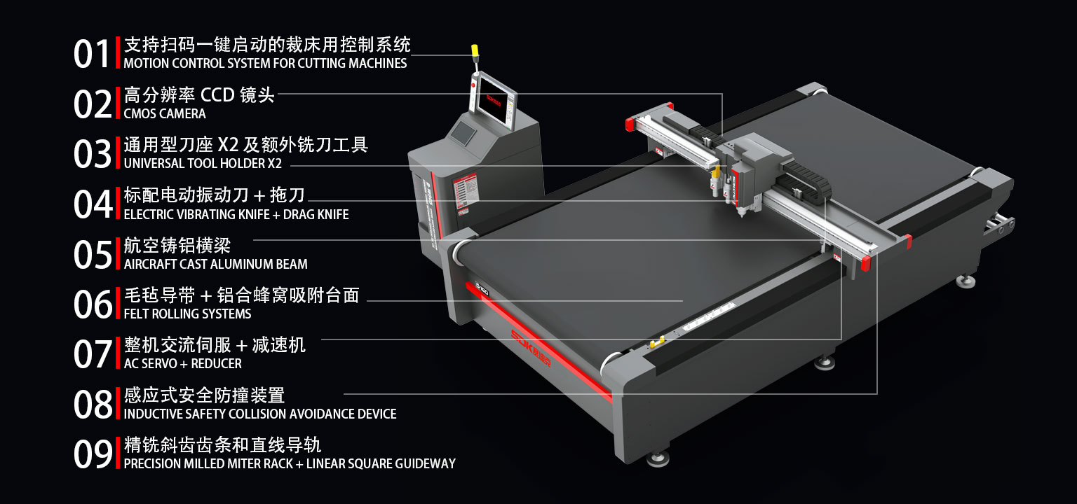 D-160C3是一款對應柔性卷材的高速異形裁切設備,采用導帶式加工平臺適合超長材料的連續切割。雙刀座,標配電動振動刀和拖刀,通用型的刀座支持圓刀、寫切刀、壓痕刀等多種刀具。支持掃碼一鍵啟動的裁床用巡邊控制系統,可高速完成柔性材料的裁切、半切、壓痕,開槽,沖孔,輪廓識D-160C3是一款對應柔性卷材的高速異形裁切設備,采用導帶式加工平臺適合超長材料的連續切割。雙刀座,標配電動振動刀和拖刀,通用型的刀座支持圓刀、寫切刀、壓痕刀等多種刀具。支持掃碼一鍵啟動的裁床用巡邊控制系統,可高速完成柔性材料的裁切、半切、壓痕,開槽,沖孔,輪廓識別裁切等多項工藝。別裁切等多項工藝。標配銑刀工具也可以用于硬質板材的雕刻加工